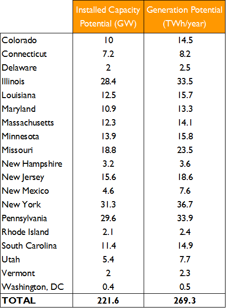 The study uses a different methodology than the Project Sunroof analysis, drawing on LIDAR (Light Detection and Ranging) and GIS (Geographic Information System) data as well as more detailed PV modeling. Most importantly for our purposes, it has the notable virtues of providing a state-by-state breakdown of rooftop solar potential in terms of capacity and annual generation, as well as a breakdown in terms of large, medium, and small buildings. We’ll use small buildings as a proxy for residential solar potential, although this may include smaller commercial buildings as well.