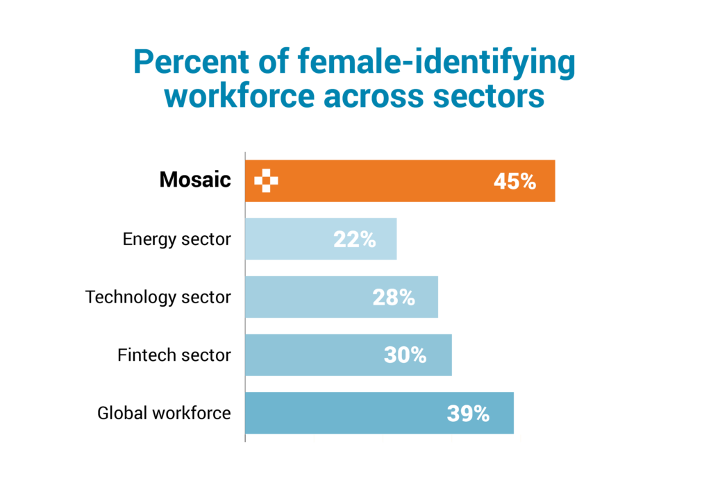 Currently, 45% of the Mosaic workforce and 47% of our leadership team identifies as female. We will continue to hire for diversity and know there is room for all of us — across different companies and sectors — to collectively grow. Women are an essential part of the clean energy movement, and there needs to be more pathways for women to do great work across all industries.